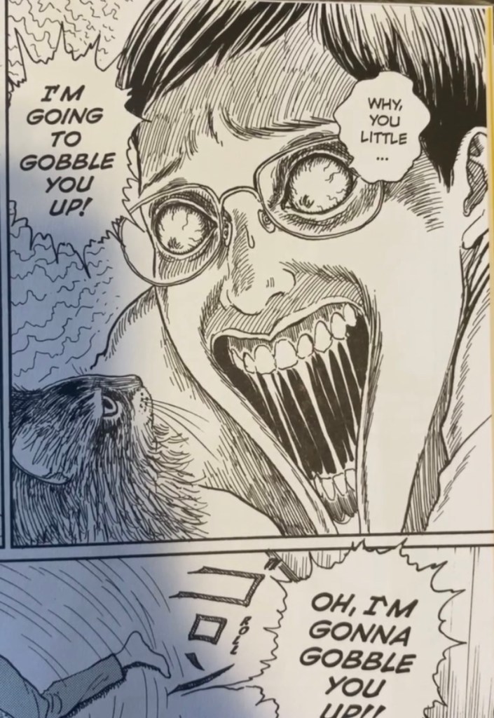 For a moment, I thought I’d been tricked into thinking this was an innocent story about living with cats when in it’s really much more sinister (I mean, it is Junji Ito after all). But it turns out J-Kun said the phrase in the same way an excited parent would say it to their young child. Instead of eating Mu, J-Kun showers Mu with kisses.